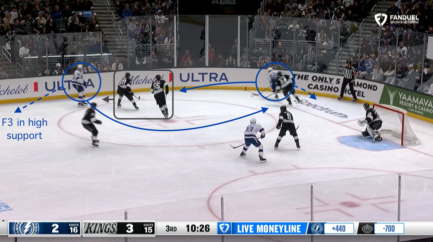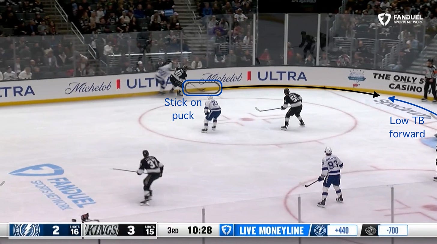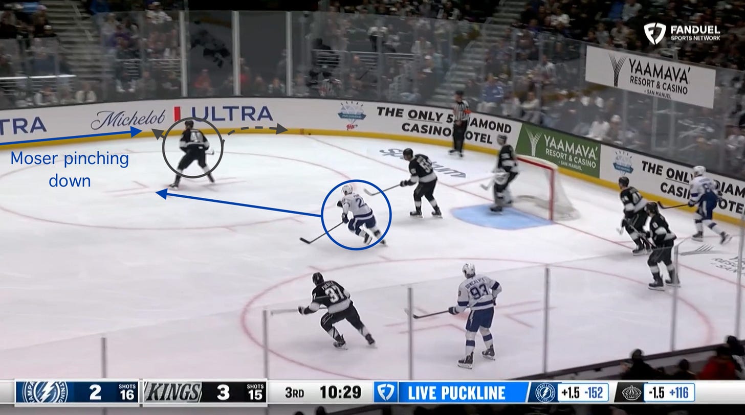 As Kucherov sizes up the situation, Moser glances back to determine whether he can double-dip in lieu of retreating to the blue line. Point remains in sound position, so LD1 capitalizes on L.A.’s forwards not knowing whether to treat him as a forward or point man.