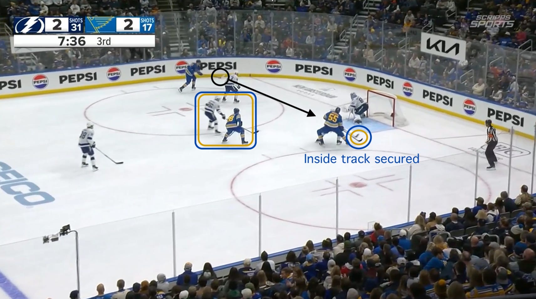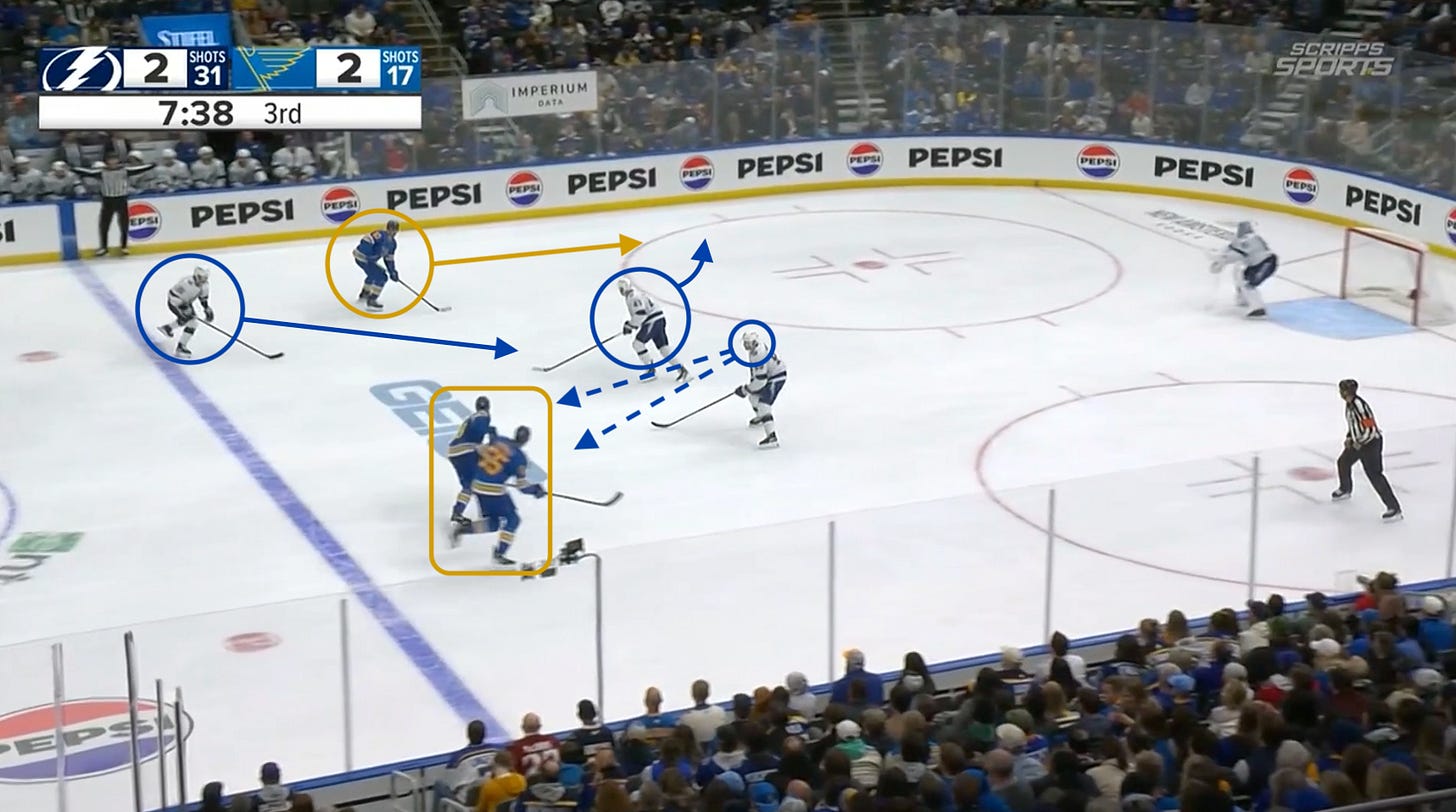 Partial 3-on-2 for the Blues. Raddysh is shading over to the puck-carrier (Brayden Schenn, STL 10), whereas Moser is out-manned on the left. He has to keep a central berth to delay Schenn’s pass and rope F3 Kucherov into the picture: