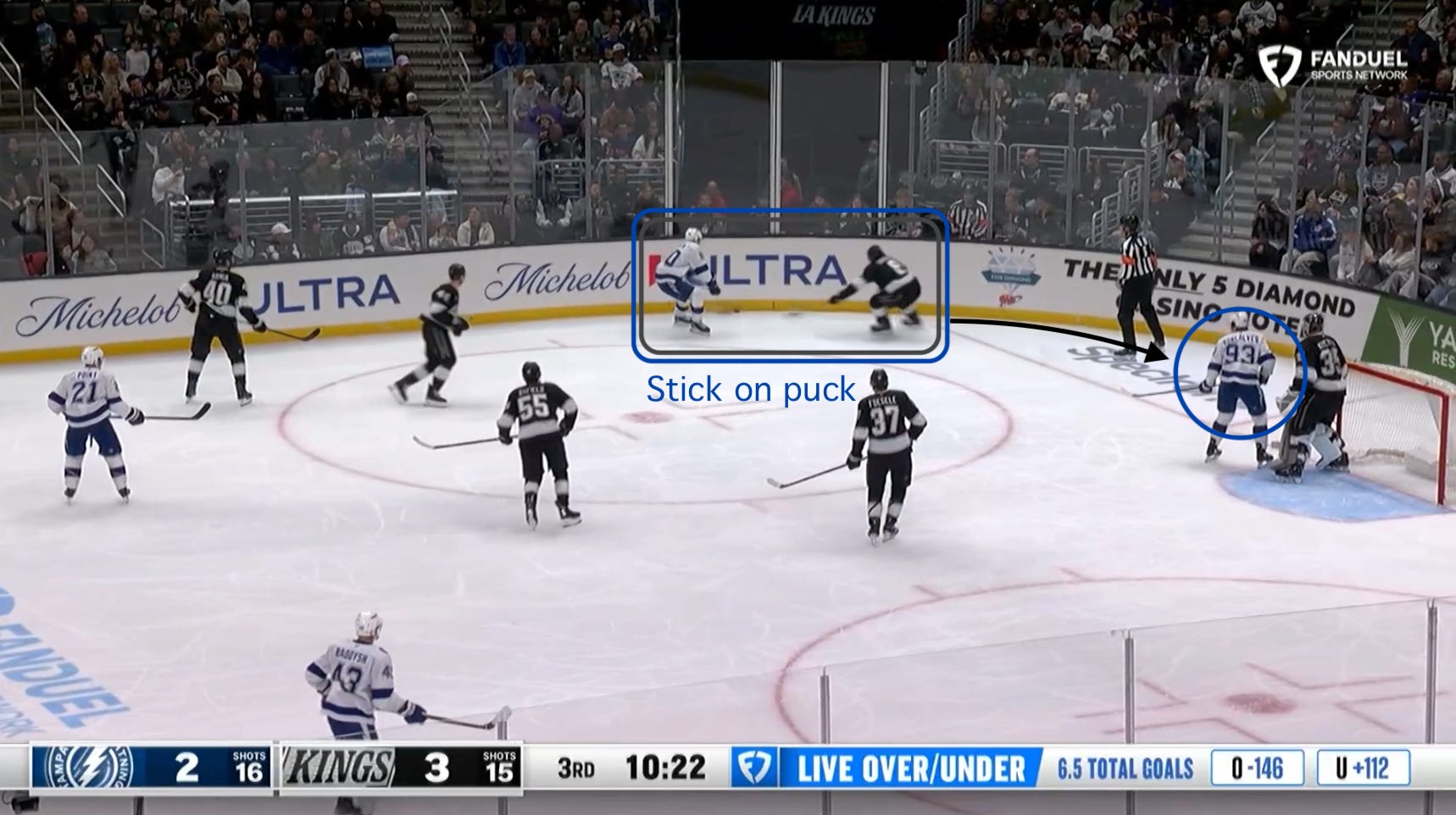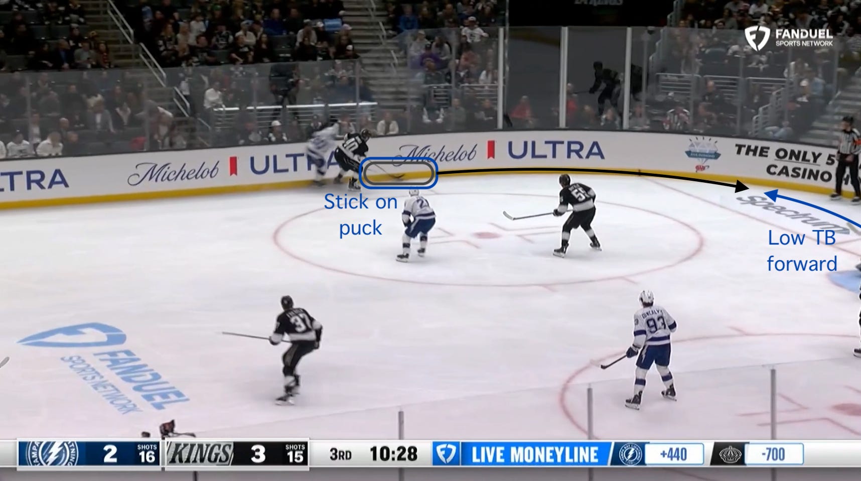 There’s no prime shooting threat for Tampa Bay’s talisman to connect with and tenacious defender Mikey Anderson (LA 44) is hot on his heels. Given the maze of bodies drifting up the strong side, Kucherov decides to play it safe. Chip down low —> hope Gage Goncalves (TB 93) can produce a stalemate or better vs. Drew Doughty (LA 8).