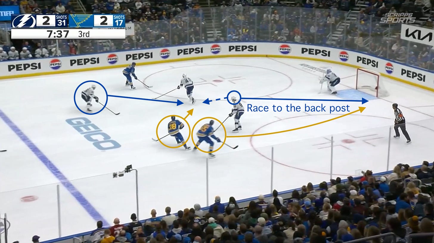 Final scan before he must pick up either the middle (Otto Stenberg, STL 28) or wide driver (Colton Parayko, STL 55). With Raddysh shepherding Schenn to the outside and Stenberg skating on an arc vs. Kucherov’s straight trajectory, Moser believes Parayko is the bigger threat. It’s now a race to the back post.