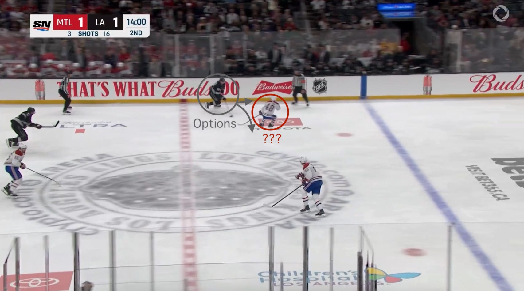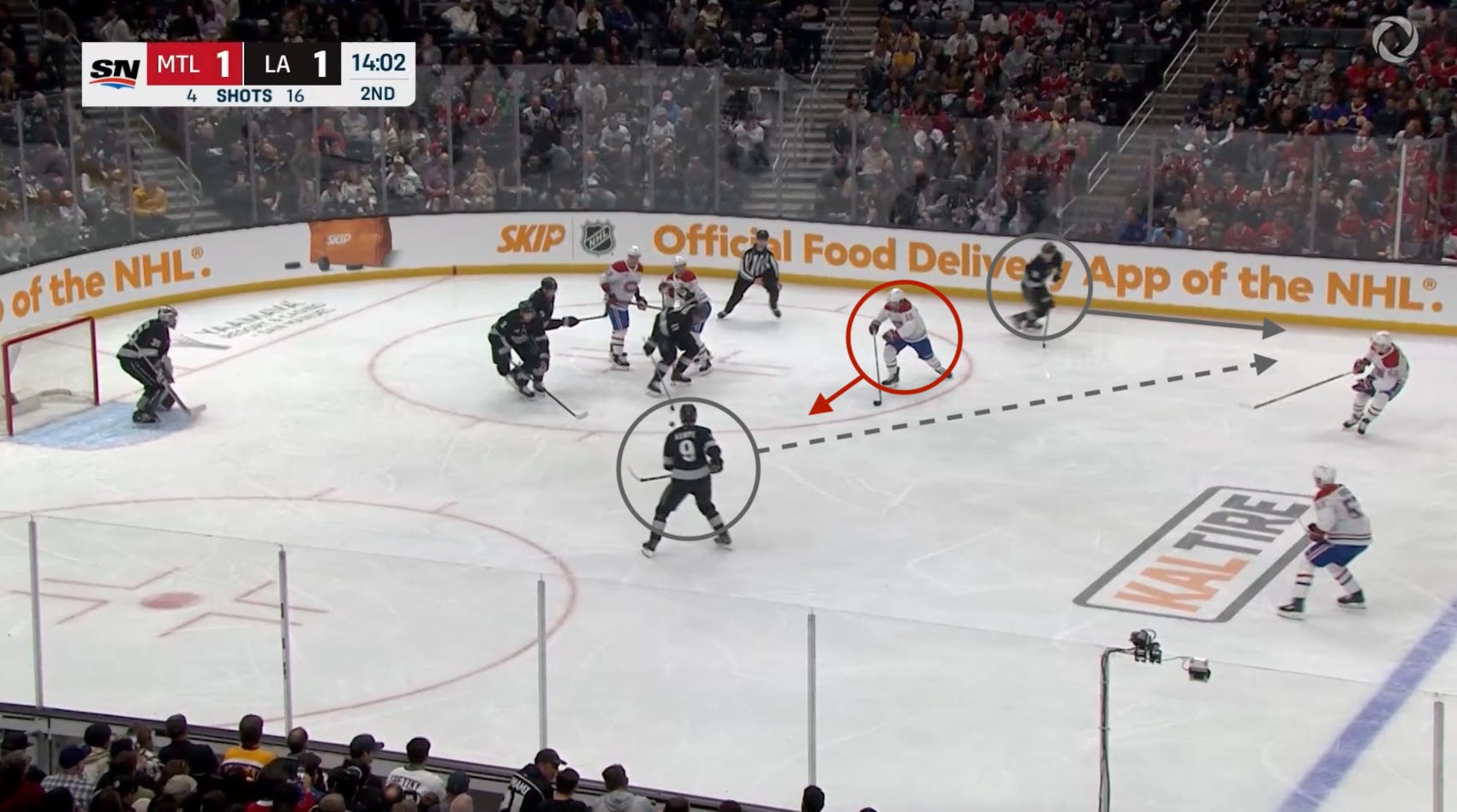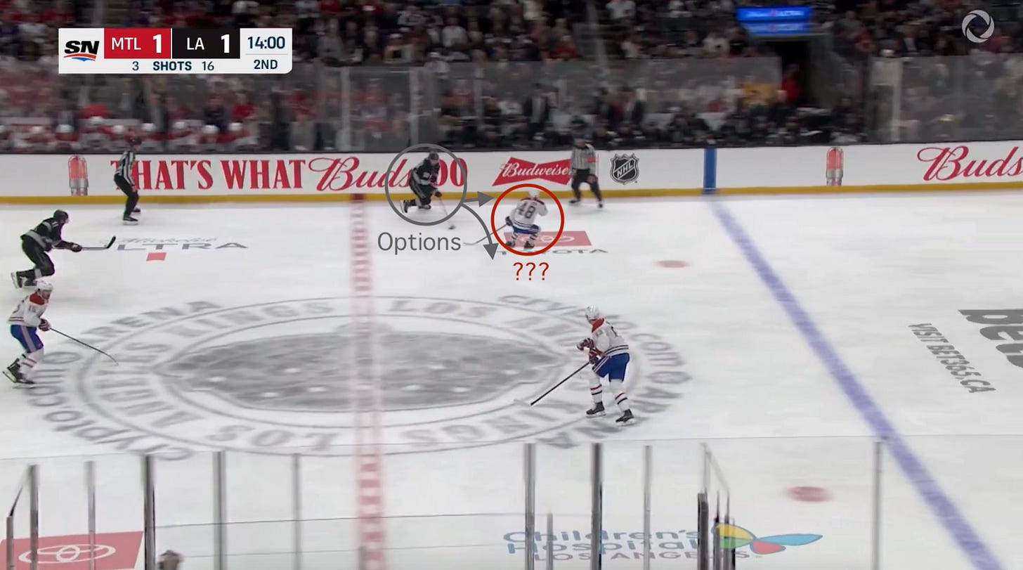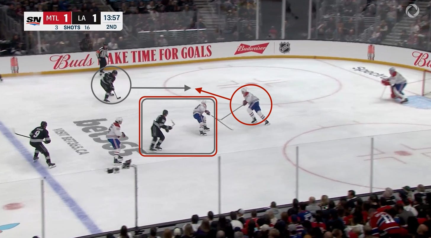 Upon his reception, Lane Hutson (MTL 48) pivots forward in hopes of killing the Kings’ offense ASAP: