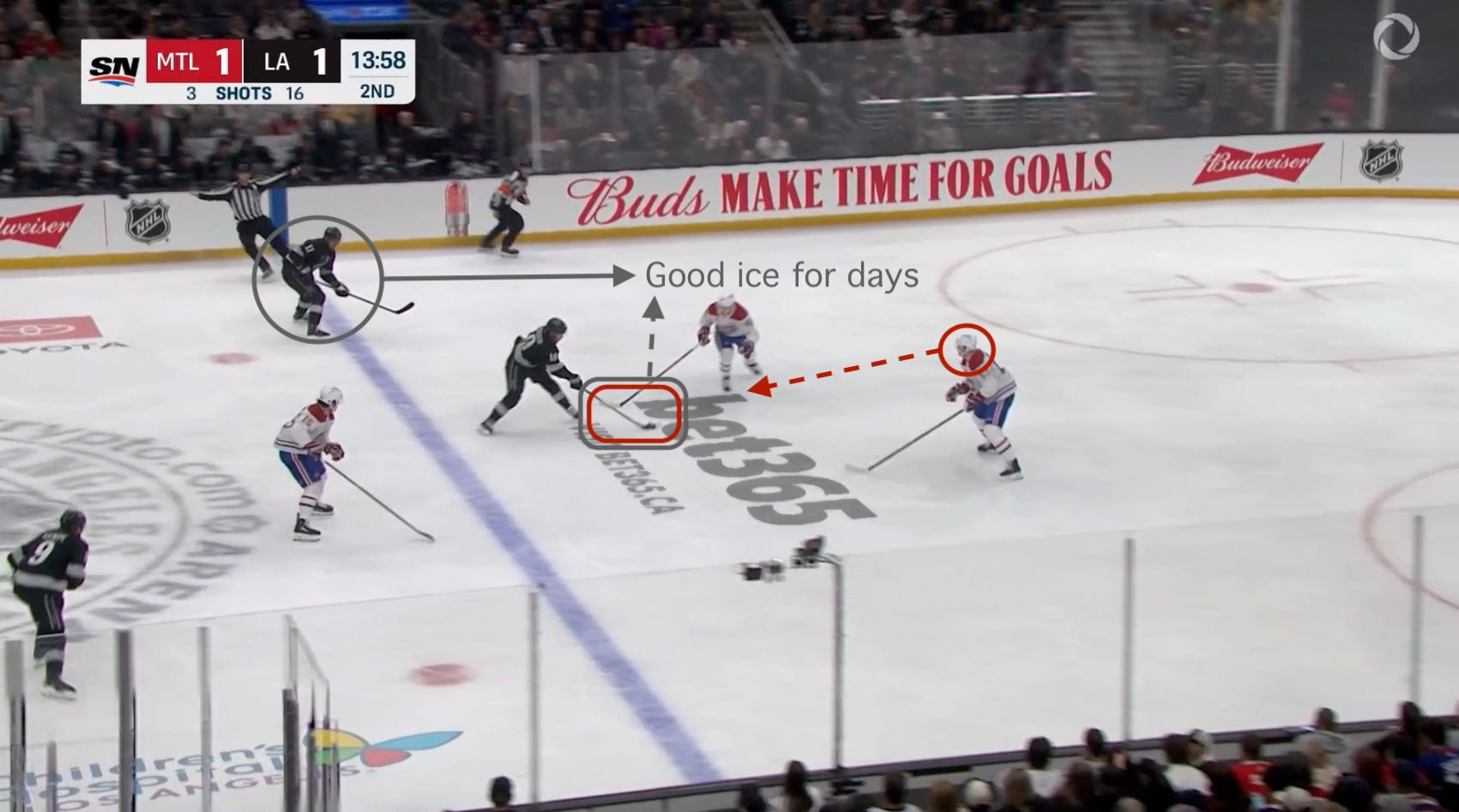 Although Montreal would love for Dobson to slide over before the advantage materializes, he sees a star winger threatening to attack from middle ice. You can understand his half-second of hesitation.