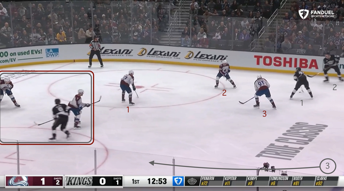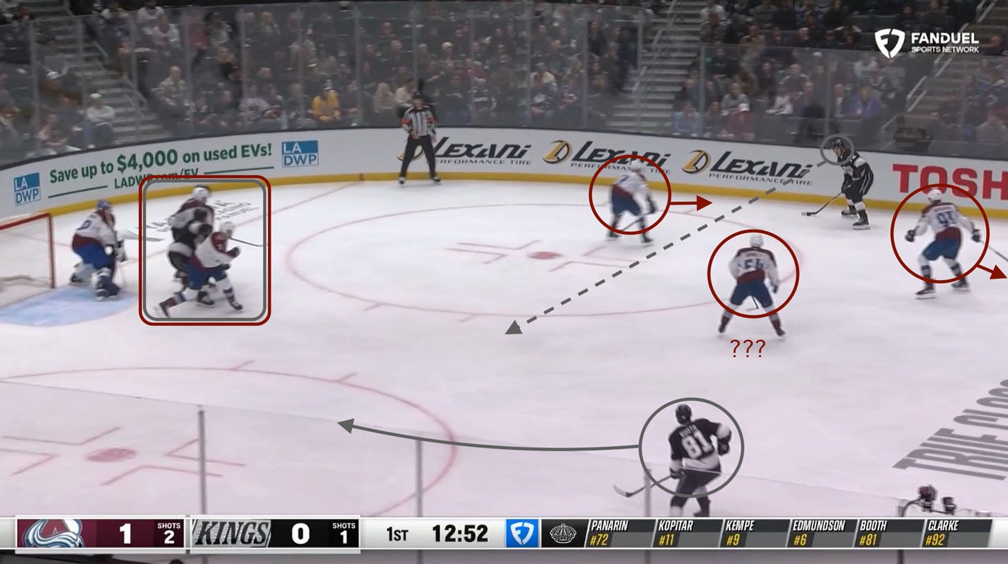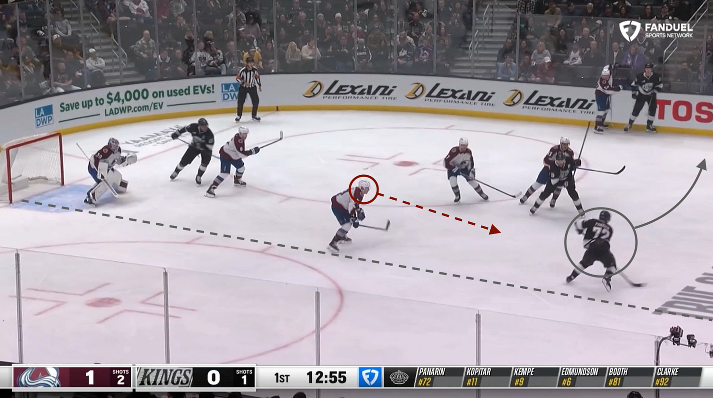 Ideally for the Avs, Gavin Brindley (COL 54) sticks to RD Brandt Clarke (LA 92) and Zakhar Bardakov (COL 93) hinders his countryman’s progress enough for Kelly to close the distance before switching to left point containment.