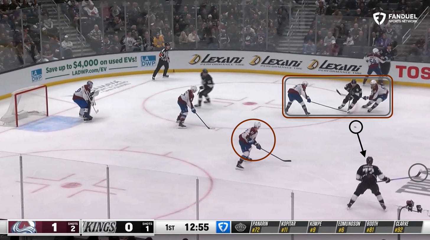 Sandwiched by Avalanche defenders, Kempe muscles the puck to Panarin on his off wing. Decent shooting opportunity from distance. Now count the number of Colorado players to the left of the dotted line: